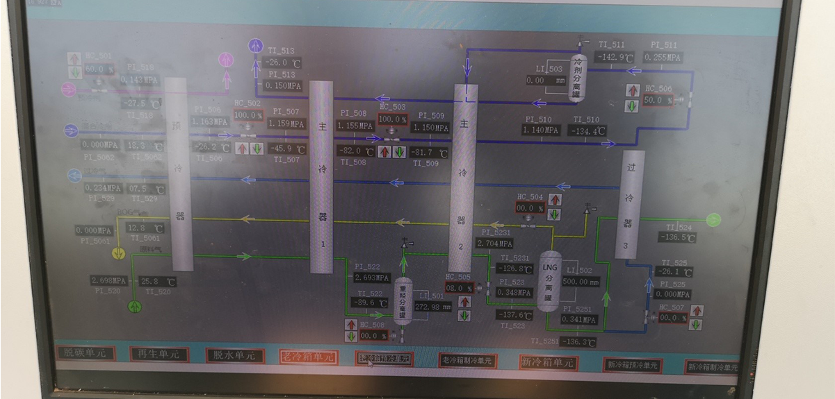 Because the project doesn¡¯t have a natural gas pipeline to send gas, it can only be transported by CNG or LNG vehicles. The liquefaction equipment is divided into five modules: 1. Primary filter unit; 2. Refrigeration unit; 3. Cold box unit; 4. Cooling unit; 5. Generator unit. Compressor used in the refrigeration unit is Hanbell RC2-Z explosion-proof medium and low temperature general compressor; After three-stage oil filtration, the oil content of the mixed working medium is reduced to the minimum. The mixed working medium exchanges heat with the gaseous natural gas in the plate heat exchanger of the cold box, and then through the natural gas self cooling process, the temperature is finally reduced to -165¡æ, realizing the natural gas liquefaction function. It is also the lowest temperature that Hanbell compressor can achieve at present.